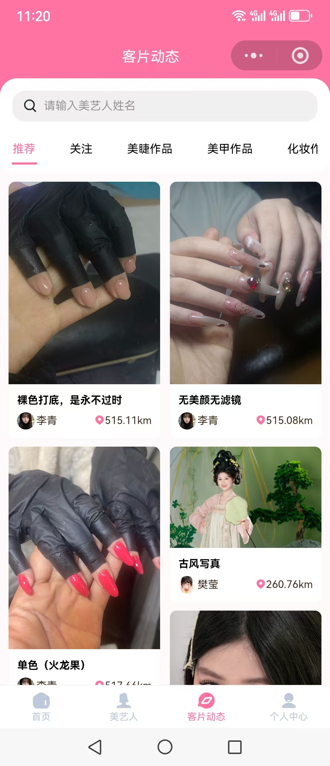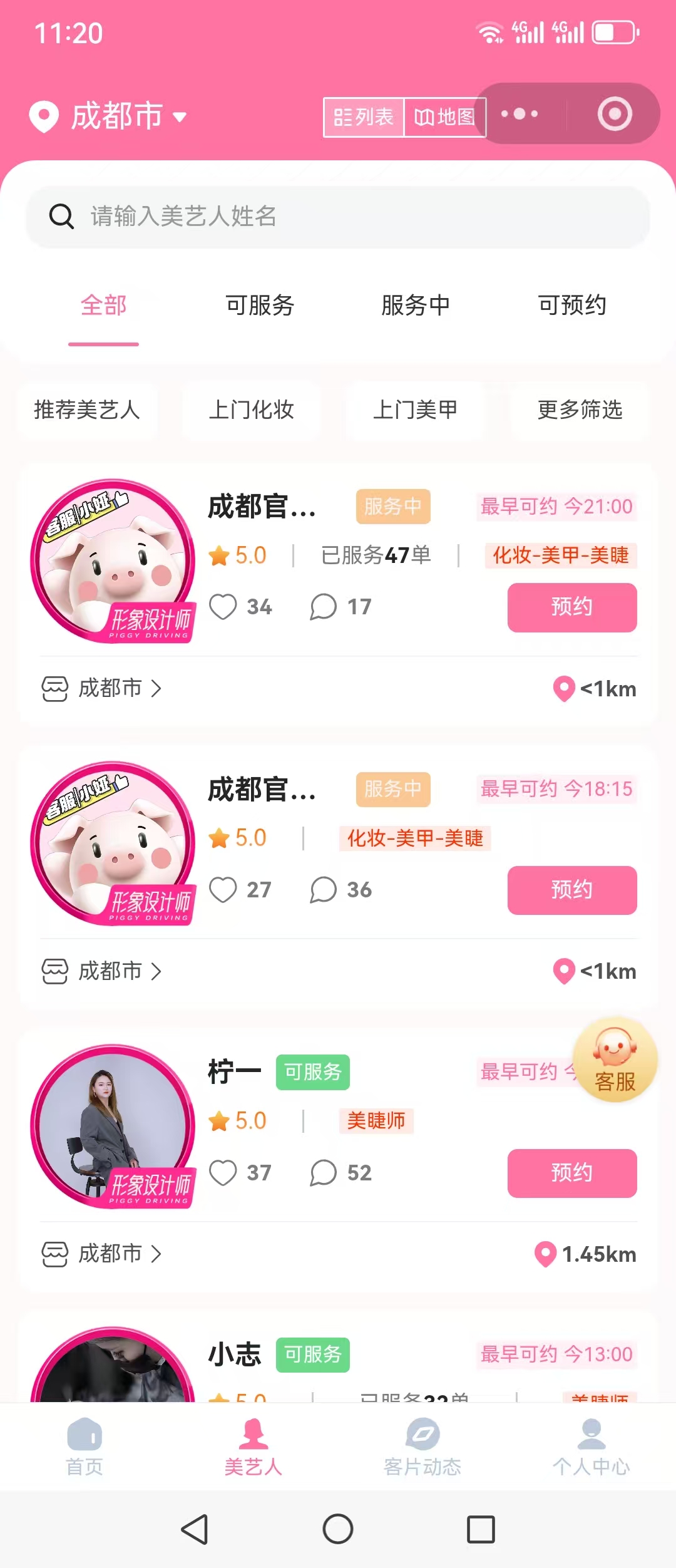 2. 透明選擇:在“美藝人”頁面,用戶可以清晰地看到每位美藝人的服務狀態(服務中/可服務)、評分、已服務單數以及距離,還能通過“客片動態”查看美藝人的真實作品,做到心中有數。